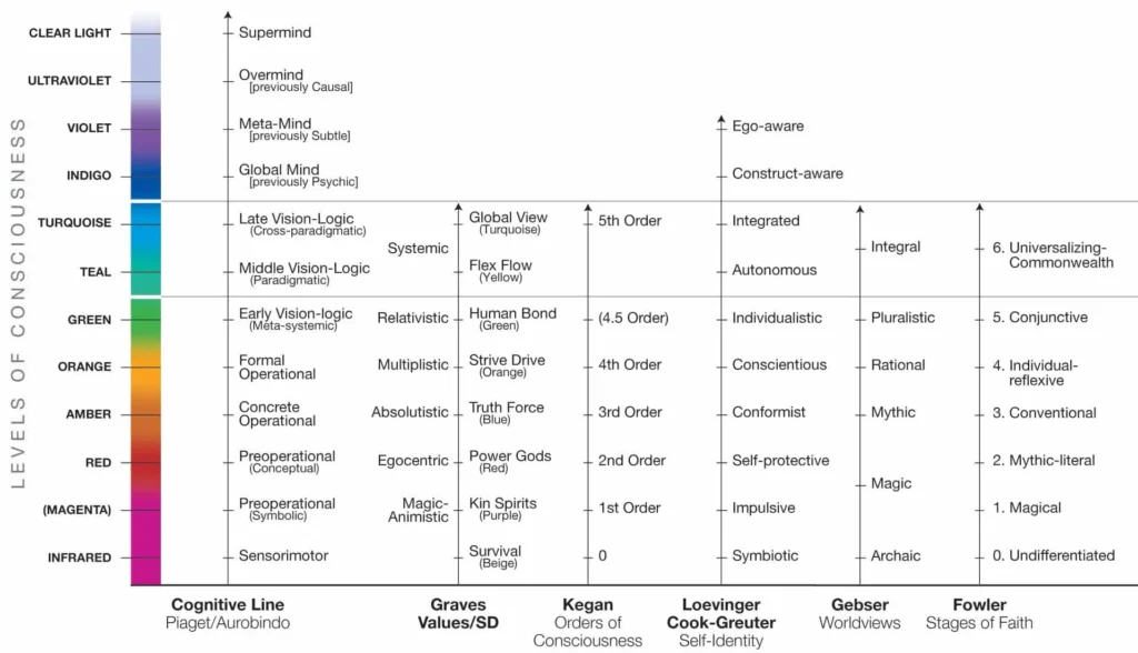 Research from Robert Kegan’s orders of consciousness, Susanne Cook-Greuter’s ego development, Terri O’Fallon’s STAGES model, and Ken Wilber’s Integral Theory, and many others over several decades …all points to a shared insight: adults continue to develop new capacities for meaning-making over time. Each stage is not better or worse but part of a trajectory. Like learning to walk after crawling, each new stage transcends and includes the earlier ones.